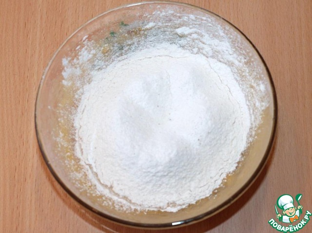 Затем просеиваем муку с разрыхлителем, добавляем кардамон и аккуратно перемешиваем тесто.