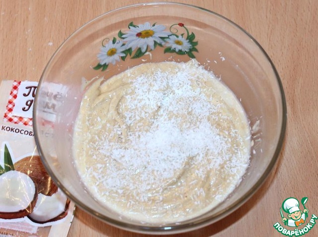 В конце вводим кокосовую стружку, перемешиваем тесто!