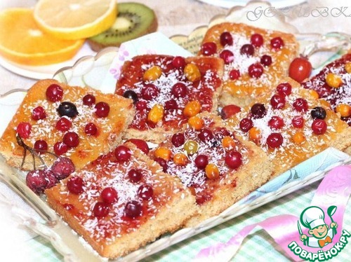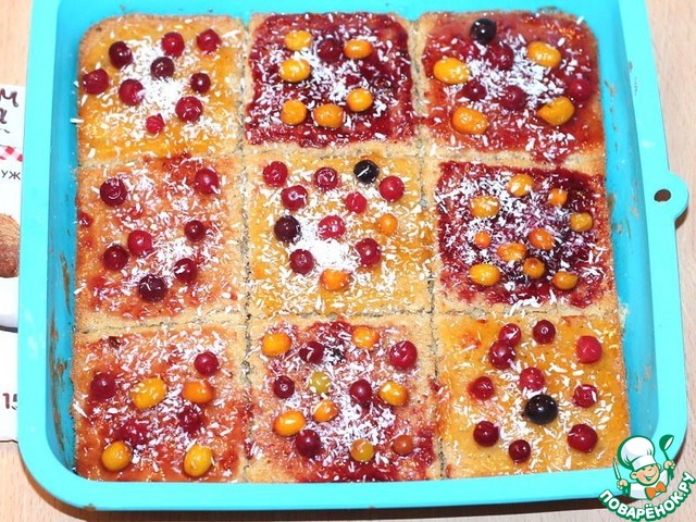 и посыпаем его кокосовой стружкой! Можно украсить мелкой ягодой. Нарежьте кекс на порционные квадраты и подавайте!