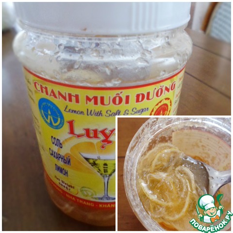 Теперь пару слов о конфитюре. Мне посчастливилось найти обалденную штуку! Как Вы сами можете видеть-все четко и ясно написано: соль сахарный лимон:)) В общем, это что-то вроде засахаренного лимона, но с солью. Что-то подобное на наших полках в России я видела. Поэтому при отсутствии данного продукта, предлагаю взять любой цитрусовый конфитюр (хотя желательно все-таки лимонный) или варенье и добавить в него щепотку соли. Естественно, для нелюбителей оригинальностей можно соль совсем не добавлять, но поверьте мне-вкус оочень необычный.