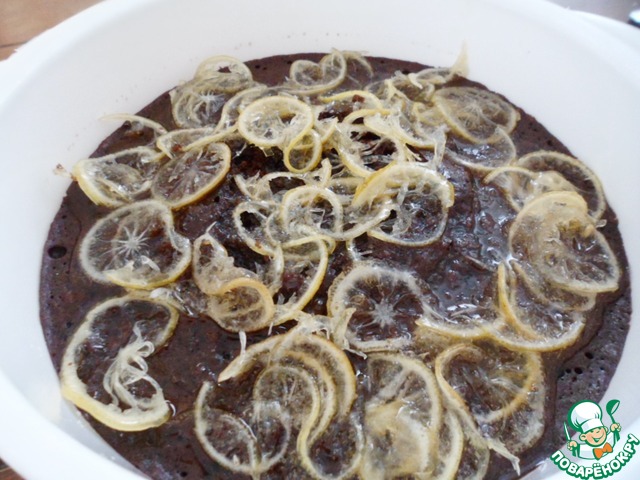 Вынимаем кейк из микроволновки и не жалея смазываем сладко-солеными лимончиками. Если конфитюр жидковат-ничего страшного-сироп впитается в тесто.