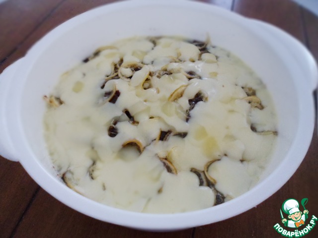 Сверху посыпаем натертым или нарезанным на мелкие кусочки сыром. У меня была моцарелла, но, думаю, лучше выйдет с голландским, швейцарским и тому подобными сырами, так как моцарелла слегка "резиноватая" для этого пирога.
