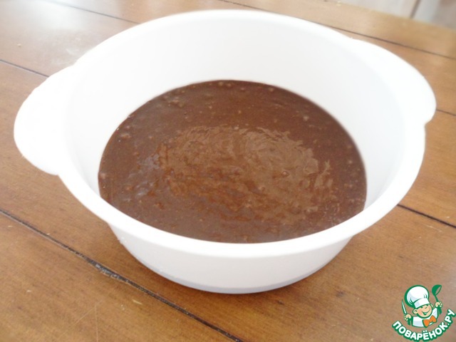 Как всегда, все просто: яйца взбиваем вилкой до смешения белка с желтком, добавляем остальные жидкие ингредиенты-масло, сливки, воду, также легонько взбиваем. Затем добавляем сахар и все остальные сухие, просеянные через сито-муку, разрыхлитель, какао, кофе. Вымешиваем тесто, чтобы не осталось комочков.