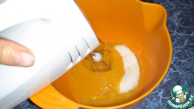 Яйца с сахаром взбить до светлого состояния в пышную массу.