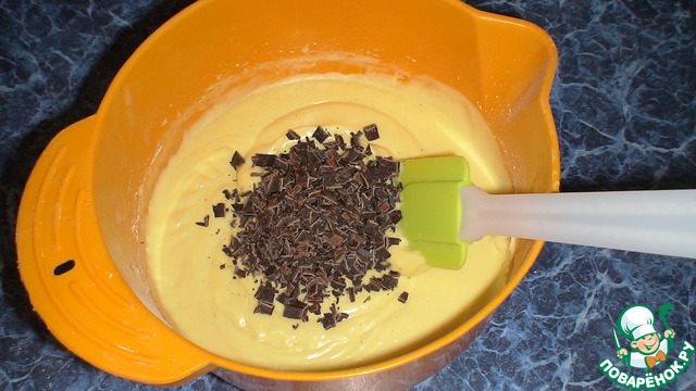Настрогать плитку шоколада ножом не очень мелко, средними кусочками и всыпать в тесто. Тщательно вымешать.