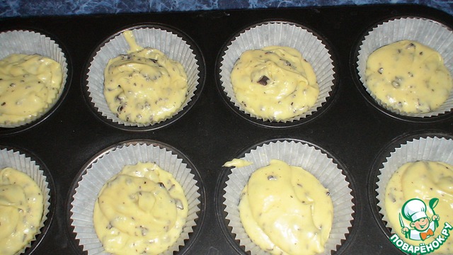 Берем форму для кексов, выкладываем бумажные формочки. Если нет формы для кексов, формочки необходимо поставить в круглую форму для торта. Если нет бумажных формочек, значит, форму для кексов смазать размягченным сливочным маслом и обильно присыпать сухарями.