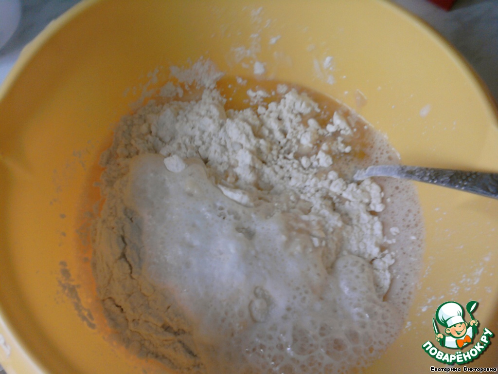 Добавляем растопленный маргарин, размешиваем, добавляем муку с погашенной уксусом содой.