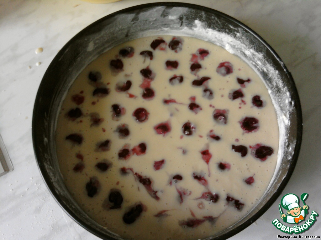 Форму смазать маргарином и посыпать мукой, вылить тесто. Сверху уложить вишню, слегка утопив её в тесто. Выпекать до готовности при темп. 250-270 гр.