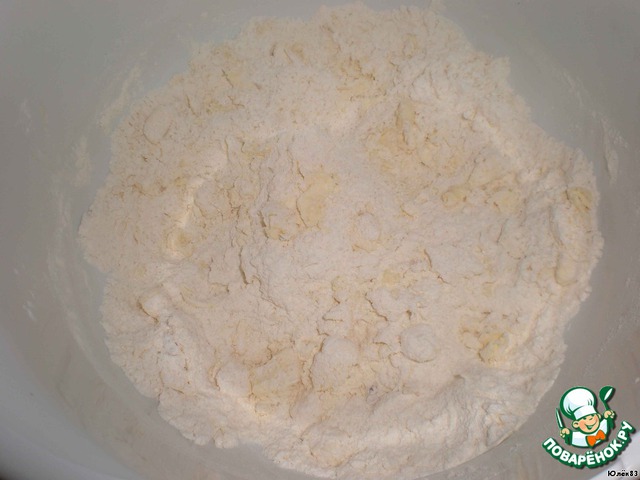 Духовку разогреть до 200 градусов.Муку смешать с сахарной пудрой и разрыхлителем.Ножом или вилкой смешать до слегка крошкообразного состояния масло с мукой.