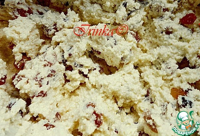 Добавляем изюм и протертый творог, хорошо перемешиваем.