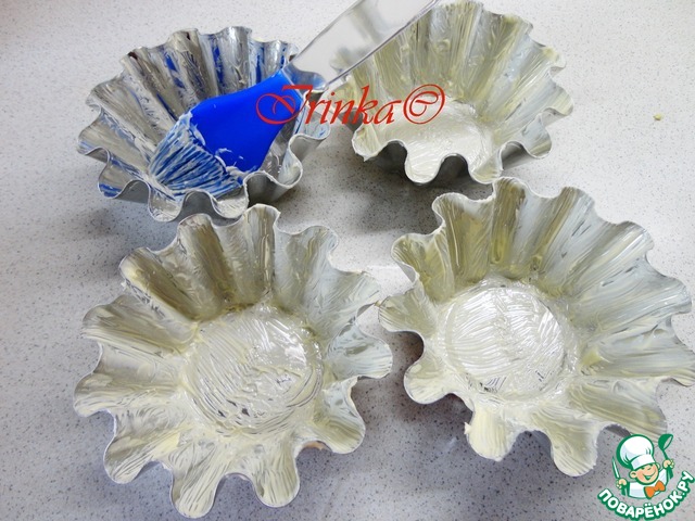 Формочки для выпечки смазываем при помощи кисточки густо-густо сливочным маслом.
