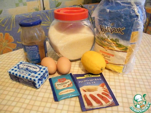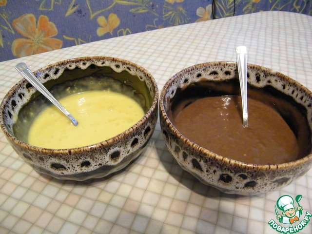Яйца взбиваем с сахаром, можно добавить щепотку соли, добавляем в массу растопленное масло и постепенно добавляем муку, ванильный сахар, крахмал и разрыхлитель. Полученную массу делим пополам. В одну часть добавляем цедру лимона, в другую какао.