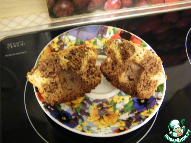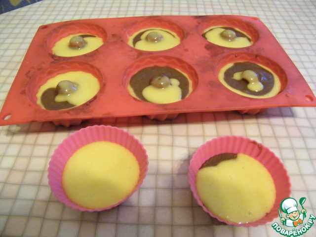 В формочки заливаем тесто: чайной ложкой по очереди кладем тесто с лимоном и какао, получается приблизительно так. Выпекаем в духовке при 180 градусах около 25 мин. (время расчитывала по своей). Надеюсь, что понравится