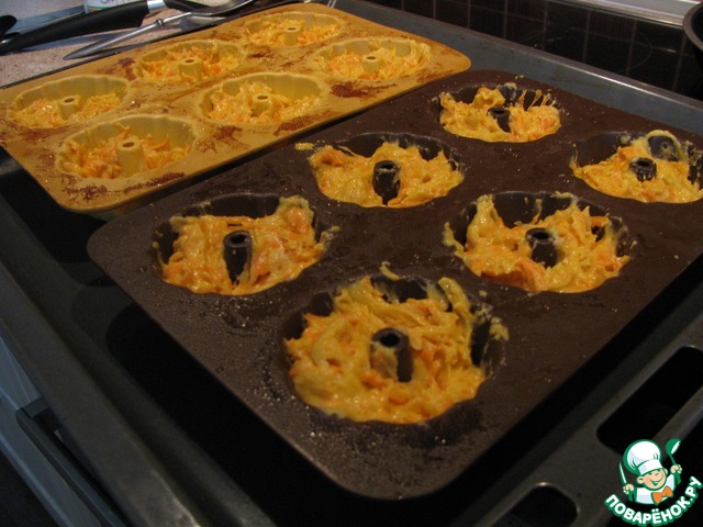 Выложить тесто в формочки до половины объема, выпекать до золотистого цвета.