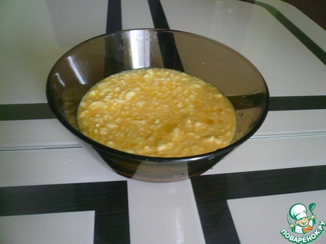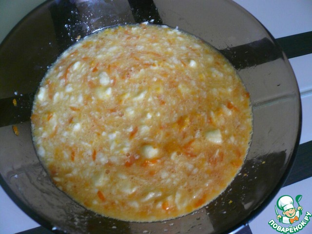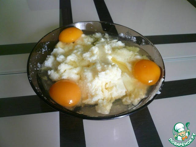 Добавить муку, соду (гашенную уксусом) или разрыхлитель, замесить не крутое тесто.