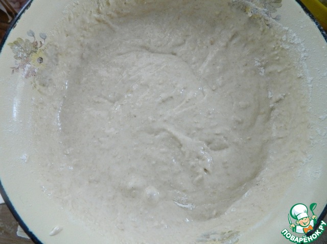 Всыпать смесь муки с овсяными хлопьями и замесить однородное тесто.