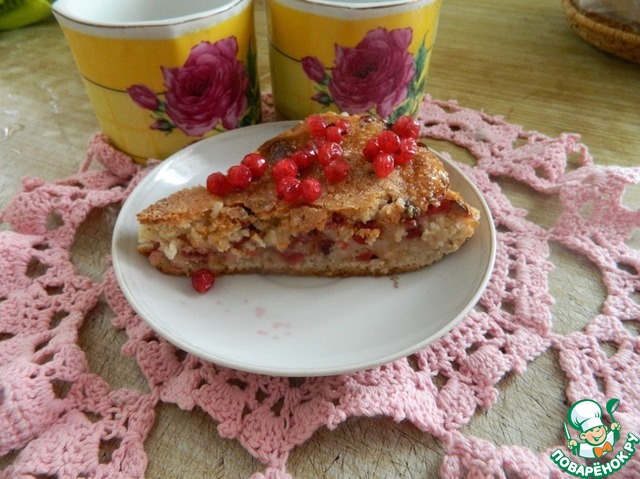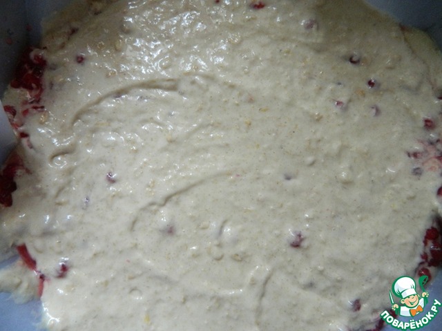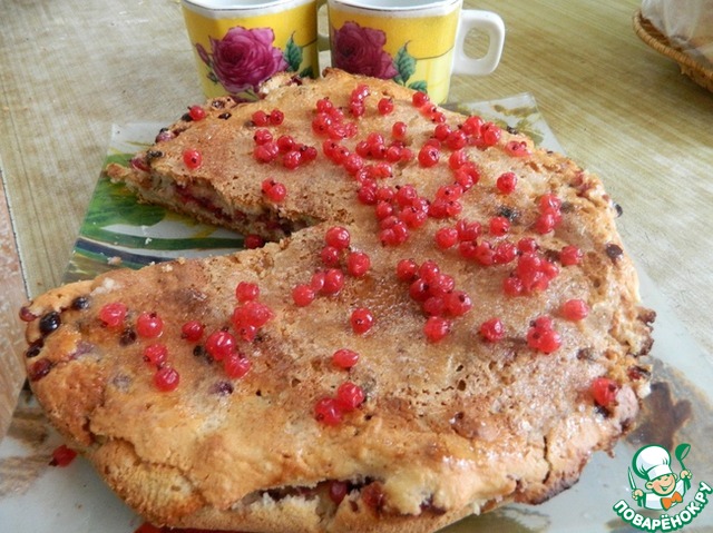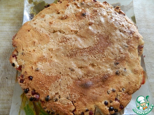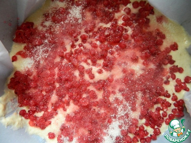 В смазанную маслом форму вылить половину теста, густо посыпать ягодами смородины, присыпать сахаром.