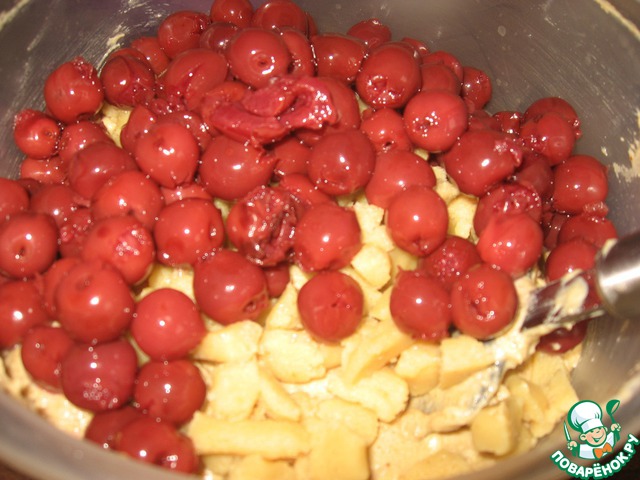Марципан порезать на кубики или руками разломать на мелкие кусочки. Вишню замороженную разморозить, свежую - вынуть косточки, а если вишня из банки - слить сок.