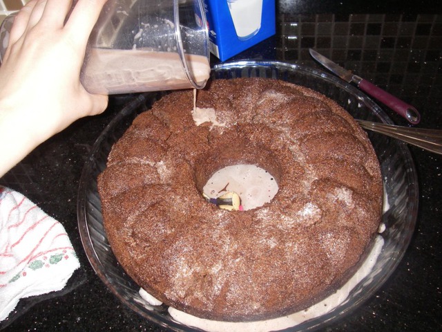 Кекс перевернуть в блюдо. Пропитать его со всех сторон. Не переживайте, что в смеси есть сырые яйца. Мы ее выливаем на очень горячий кекс, они успевают свариться.