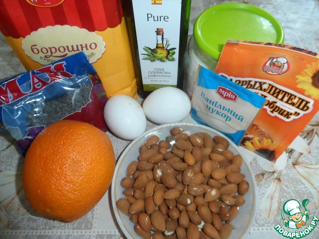 Смешайте оливковое масло, 175 г сахара и яйца, а затем добавьте молотый миндаль, цедру, кукурузную муку, мак, разрыхлитель и ванильный сахар. Фото плохо отражает яркость и сочность цветов, тесто очень очень красивое и ароматное!!! Я даже несколько ложек съела просто так, восхитительно еще в сыром виде)))
