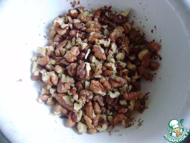 Орехи слегка измельчаем, чтоб остались крупные кусочки. Обычно я делаю это руками или в ступке. Добавляем их в тесто.