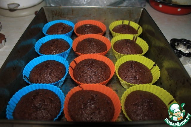 Формочки заполнять на 2 \ 3, в середину положив кусочек молочного шоколада. В духовку ставим на 10-15 минут