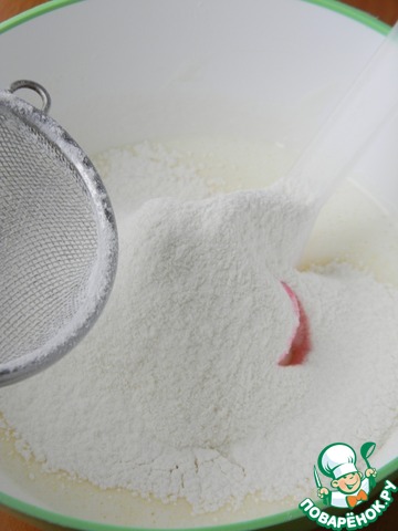 Муку соединить с содой и разрыхлителем. Просеять к яйцу с сахаром. Перемешать лопаткой.