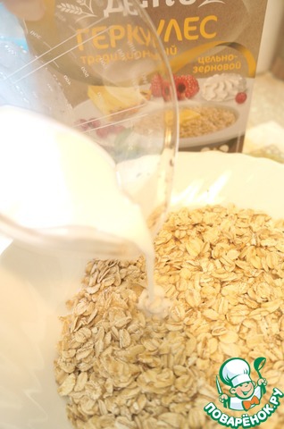165 граммов овсяных хлопьев "Мистраль" залить молоком. Подогреть в микроволновке 1,5 минуты.