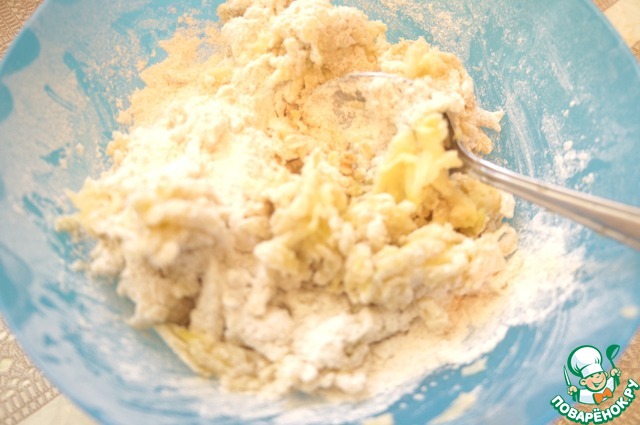 Оба вида муки просеять, добавить разрыхлитель, сахар, хлопья с молоком, корицу, тёртое на крупной тёрке яблоко. Отдельно взбить яйцо, добавить масло и еще хорошо взбить до загустения.