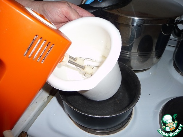 Яйца взбивать на водяной бане, постепенно добавляя сахар 5 мин.