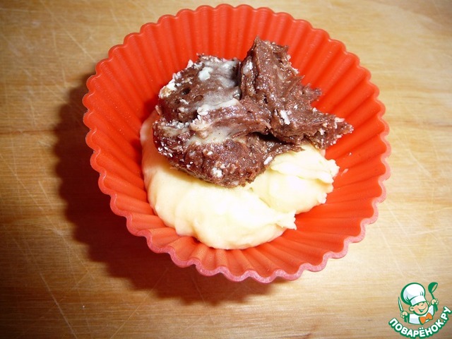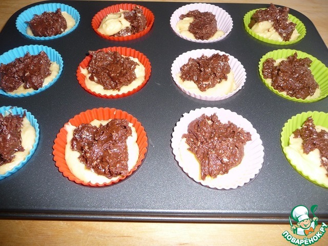 Формочки для маффинов заполнить белым тестом, сверху темное. Форму смазать маслом, силиконовые не смазывать.
