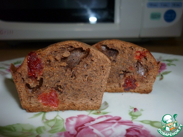 Замесить тесто. Смешать все сухие ингредиенты, смешать все жидкие ингредиенты, соединить обе смеси. Добавить (отжатую) вишню и марципан. Перемешать. Разложить тесто по формочкам. Выпекать 20 мин при Т=180 С