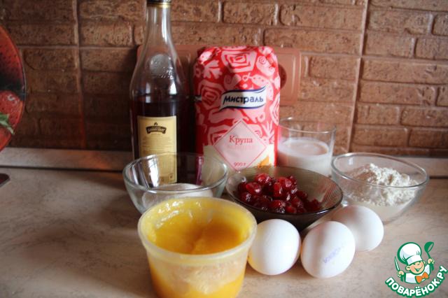 В миске смешиваем крупу манную, йогурт, мед, сахар. Даем настояться тесту 30 мин. Черешню нарезаем на более мелкие кусочки, заливаем коньяком и отставляем в сторону примерно на 30 мин. Несколько раз перемешиваем в процессе настаивания.