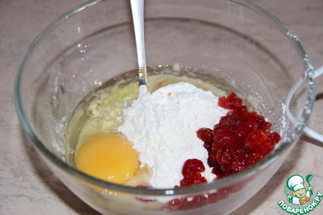 По истечении 30 мин. в манное тесто добавляем яйцо, муку, разрыхлитель, растительное масло, цукаты, и тщательно перемешиваем.