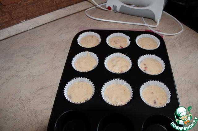 Формочки заполняем тестом на 2/3. Выпекаем кексы в разогретой до 190 ° C 25-30 минут до золотистого цвета. Проверяем зубочисткой или спичкой тесто на готовность.