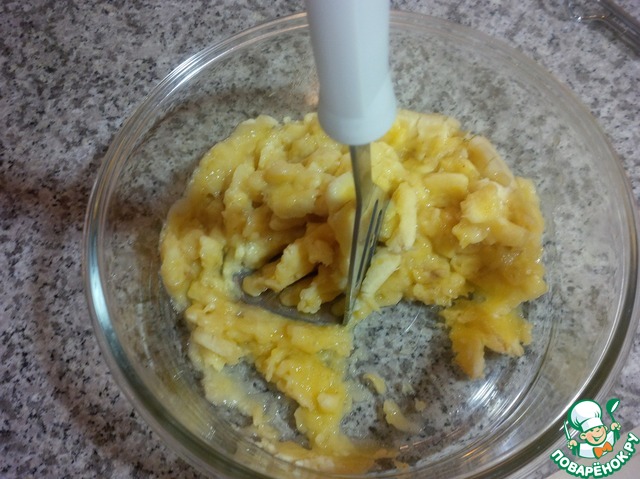 Банан превращаем в кашицу. Можно толкушкой, можно блендером.