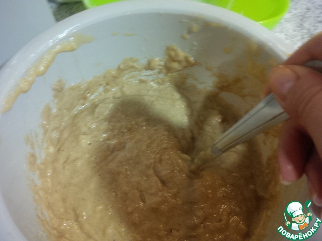 Теперь важно: поэтапно добавляем к жидкой смеси муку: буквально 5 ст. л. муки, потом чуть чуть горячей воды, перемешиваем, потом опять немного муки, перемешиваем, потом опять чуть горячей воды и так по-немногу добавляем муку и воду. Вода у вас закончится быстрее муки. Оставшуюся муку добавляем по-тихоньку, постоянно перемешивая. Как только добавили остатки муки, совсем немного перемешаем до однородности и наше тесто готово. Не нужно его долго мешать и передерживать! Оно может не подняться, если с ним долго работать. Тесто получается как очень густая сметана, но оно легко перемешивается и легко накладывается в форму.