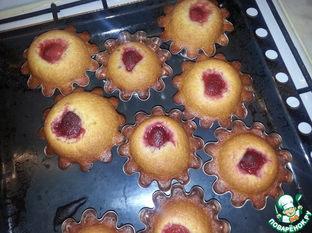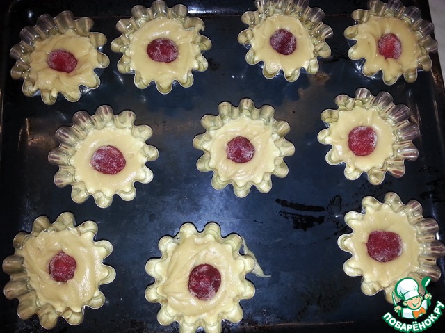 По желанию можно добавить клубнику свежую или замороженную. Я добавляла замороженную. Отправляем кексики в предварительно разогретую до 180 градусов духовку на 25 минут.