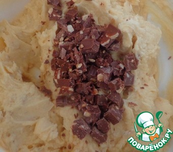 Шоколад я взяла молочный с орехами. Шоколад измельчить на кусочки и добавить в тесто, перемешиваем.