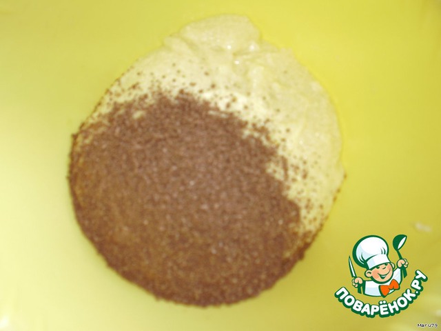 Смешать ингредиенты для теста. Хорошо размешать и разделить на три части (примерно равных). В одну добавить пакетик пудинга или сливок.
