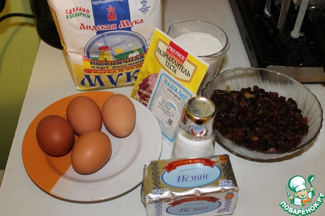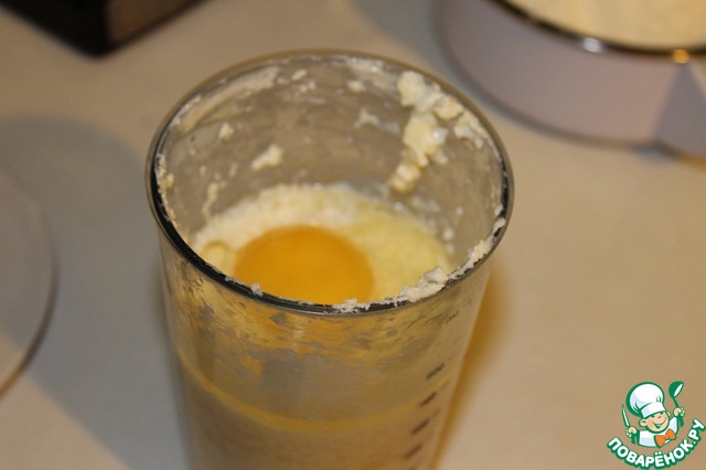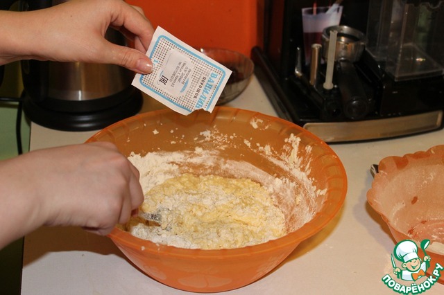 Муку просеиваем, смешиваем с разрыхлителем и добавляем не большими порциями в яйца с маргарином, все хорошенько взбиваем.