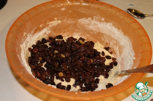 Добавляем изюм. (я заранее замачиваю в воде, чтобы он немного размяк)