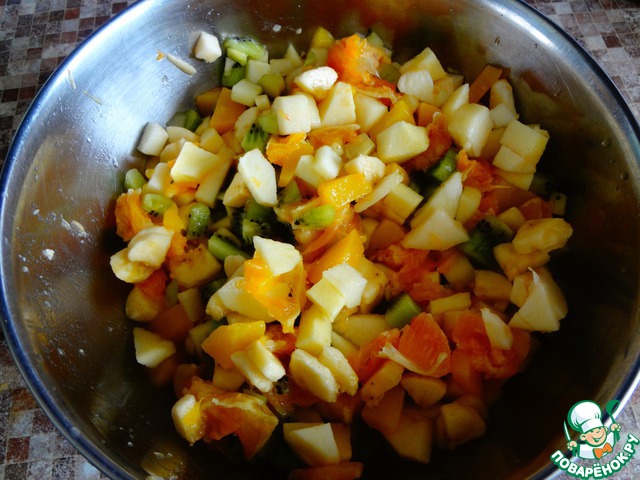 Фрукты тоже сложить в чашку с тестом. Всё перемешать.