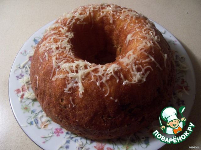 Готовый кекс немного остудить, перевернуть, вытянуть из формы и посыпать тёртым сыром.