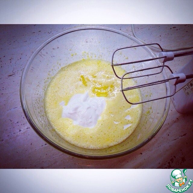 Затем, добавляем сметану, масло (заранее растопленное) и хорошо взбиваем миксером.