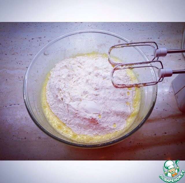 Затем, добавляем муку, разрыхлитель и взбиваем до однородности.