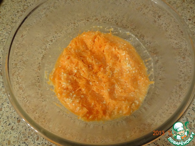 Морковь вымыть, очистить от кожицы, натереть на мелкой терке. Добавить к творожной массе. Перемешать.