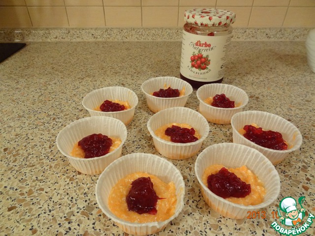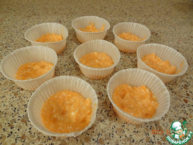 Формочки смазать подсолнечным или сливочным маслом, выложить в них часть теста, заполнив на одну треть.