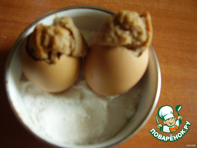 Налейте немного растительного масла в каждую скорлупку и покрутите в руках, чтобы смазать стенки. Наполните скорлупки тестом и поставьте их в форму (я взяла металлическую миску), а чтобы они не падали насыпьте слой соли (1,5-2 см).