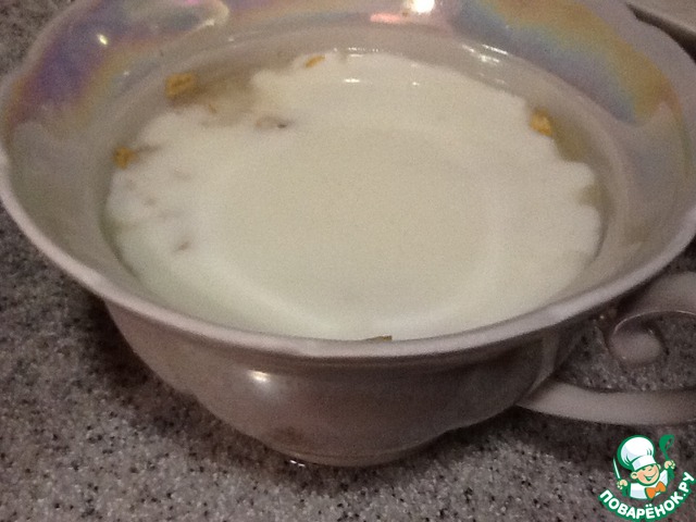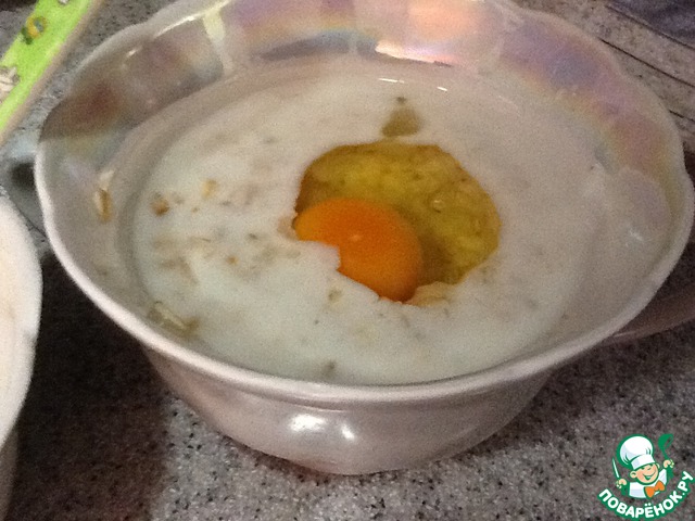 Цельные хлопья заливаем кипятком, даем настояться до остывания. Заливаем кефиром. Перемешиваем.